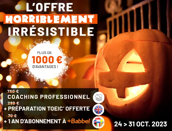 (1) Valable pour les nouveaux inscrits à une formation complète (enseignement général et professionnel), à l’exception de la préparation TOEIC, dont le contrat d’enseignement sera retourné signé entre le 01/11/2023 et le 08/11/2023 et dont le paiement de la première mensualité aura été effectué au plus tard le 08/11/2023. Le contrat d’enseignement devra ainsi être établi au plus tard le 31/10/2023 compte tenu du délai de signature légal de 7 jours francs. L’offre horriblement irrésistible comprend un coaching professionnel (accès à une série de webinars sur l’employabilité), la préparation TOEIC offerte et un abonnement d’un an à Babbel pour une langue. Les accès aux services de Babbel seront envoyés par email après validation de l’inscription de l’étudiant et seront valables pendant 1 an à compter de la date d’activation du compte sur Babbel. Les frais de l’examen TOEIC sont à la charge de l’étudiant(e).